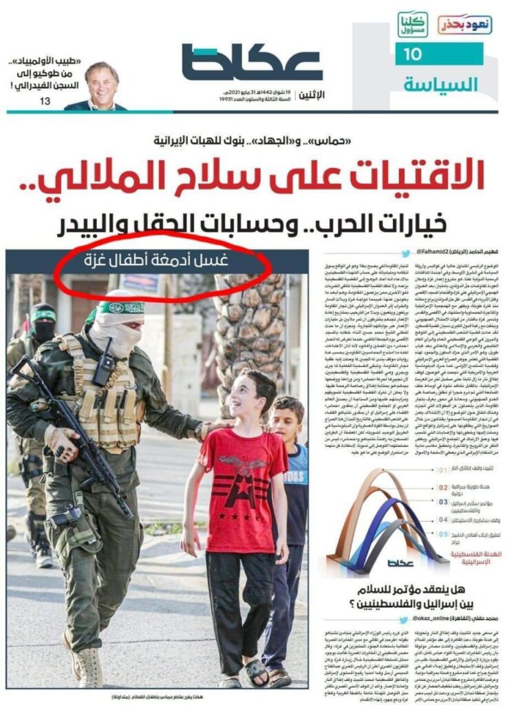 استنكر الكاتب والمحلل السياسي الفلسطيني الدكتور فايز أبو شمالة، نشر صحيفة عكاظ السعودية في عددها الصادر يوم الإثنين 31 مايو/ أيار 2021، تقريرًا يهاجم المقاومة الفلسطينية مرفقاً بصورة معنونة بعبارة “غسل أدمغة أطفال غزة”.